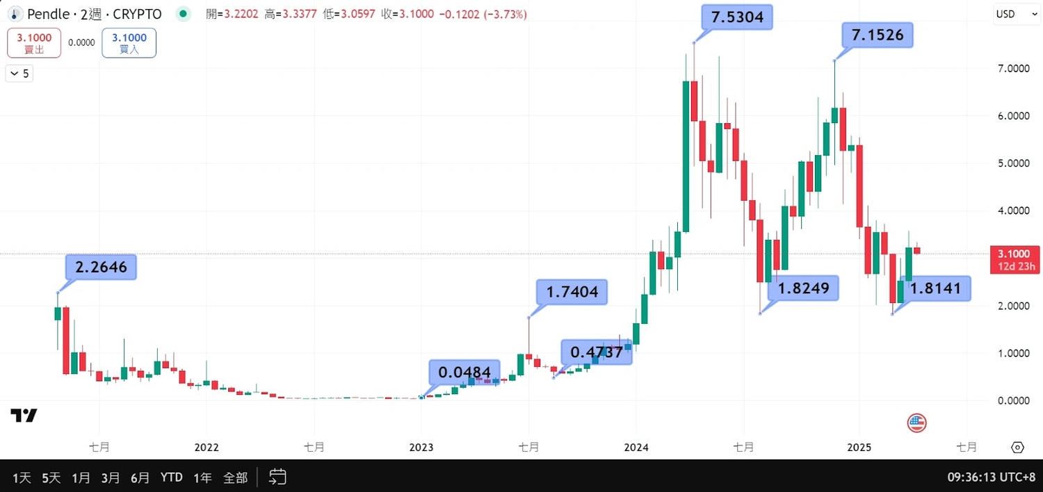 自 Pendle 币于 2021 年上线以来,价格历经多次剧烈波动,受 Defi生态成长、再质押(Restaking)热潮与市场资金轮动影响显着: