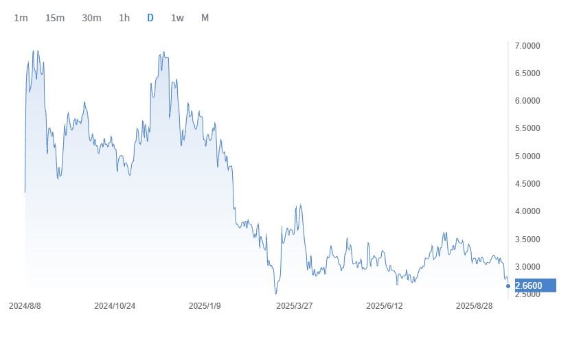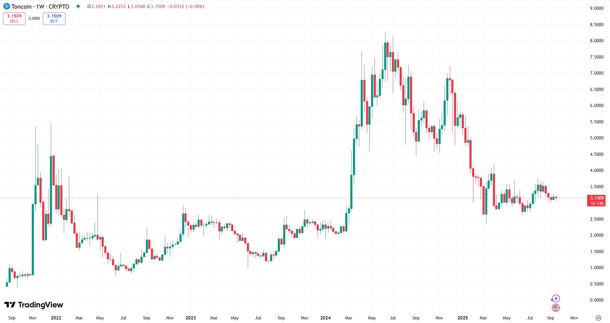 Ton在2024年因生态系爆发(如USDT集成、迷你应用程序兴起)而一路飙升,于同年6月创下8.24美元的历史新高。然而,市场随后遭遇逆风,包括2024年8月创办人Pavel Durov于巴黎被捕等事件冲击信心,导致价格大幅回调。进入2025年,TON进入震荡整理期,截至2025年9月初,其价格约报3.16美元,较历史高点有显着跌幅,整体走势充分反映了其与Telegram生态深度绑动的高风险与高波动特性。