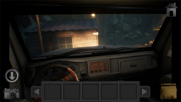 2、出门后注意到保险丝盒损坏,且位置过高无法触及。返回左侧路径走向海滩,登上船找到车钥匙,开启车灯照亮前方的小屋。