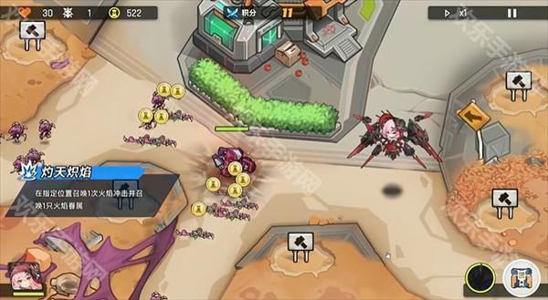 1、怪物会在红圈的地方出现,玩家需要在地上立着标牌的地方建设机关枪、发射炮和盾牌等武器。通过打怪获得金币,再用金币升级武器以面对下一波更强势的怪物。