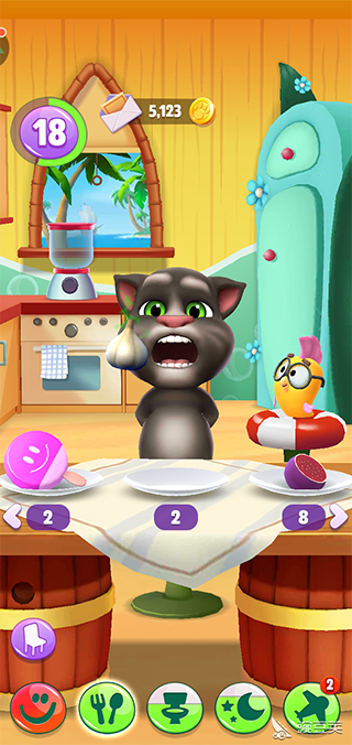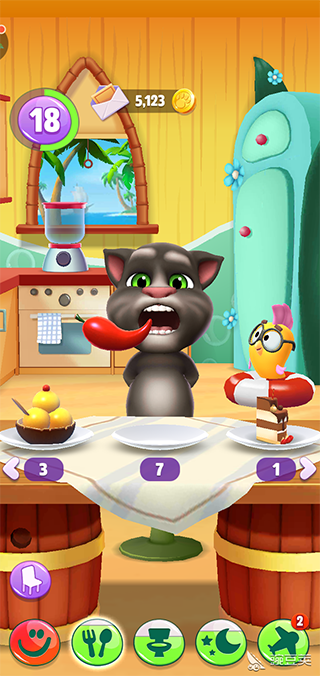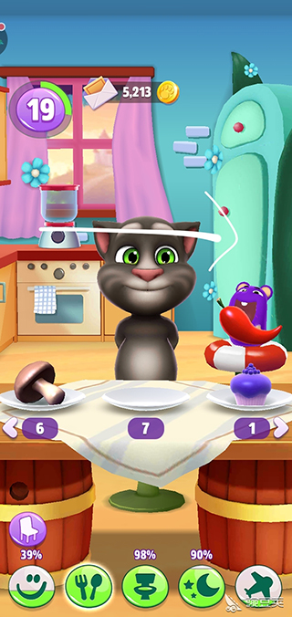 3、个性化需求满足:根据汤姆猫的状态(饥饿、困倦、无聊),玩家需及时提供食物、睡眠或娱乐,培养责任感与决策能力。