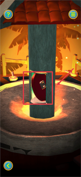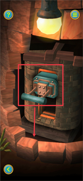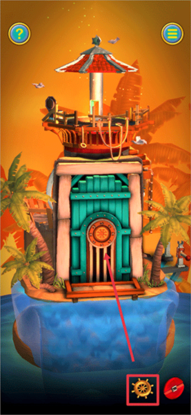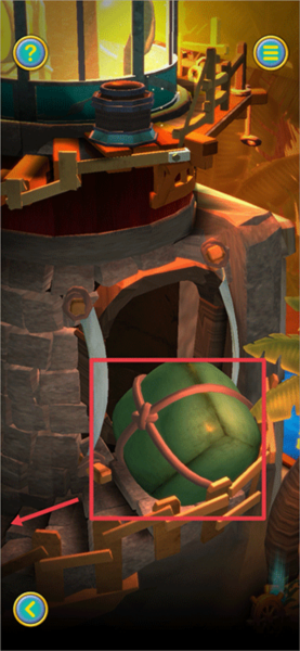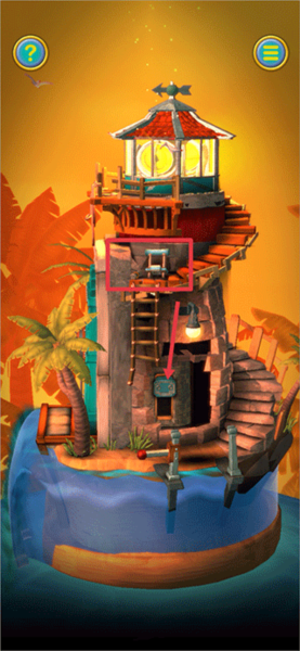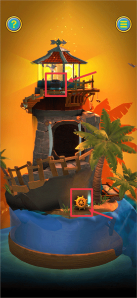 2、当触发第二段教程后,首先返回缩小画面,接着把灯塔转动至下图所示的角度。此时,上方的盒子能够通过划动打开,从中获取【红宝石】;下方则可以获取【船轮】和【蓝宝石】 。
