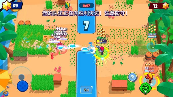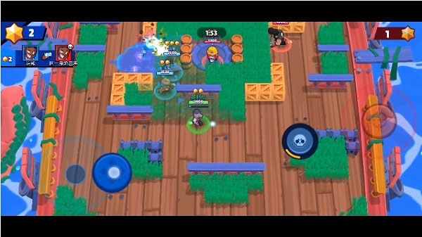 Brawl Stars 分为人机对战和实时对战模式。你既可以随机选择在线玩家组队,也可以创建房间,邀请好友一同开战。第一次进入游戏会有玩家新手指导,游戏采用虚拟摇杆加按键操作,左手控制方向,右手点击敌人瞄准攻击,每三个人组成一个战斗小队。操作非常简单。