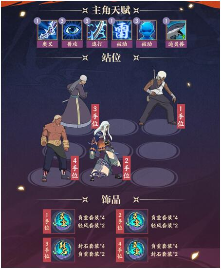 1、因为达鲁伊的被动【漫不经心】的效果,所以选择负重套装,并且把达鲁伊放在前排才能更好的发挥这个被动的作用,能够更好的应对像波风水门【青年】这种能大概率起手且伤害很高的忍者。
