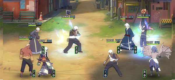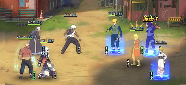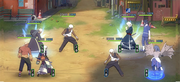 第一回合,三船奥义敌方大蛇丸【青年】,遭到波风水门【青年】的打断。之后双方各自普攻,从图中可以看出,虽然我方佐助【须佐能乎】血量很低,但敌方的波风水门【青年】在我方忍者的多次普攻以及追打后战败,所以我方可以在第二回合实现四打三。