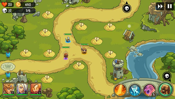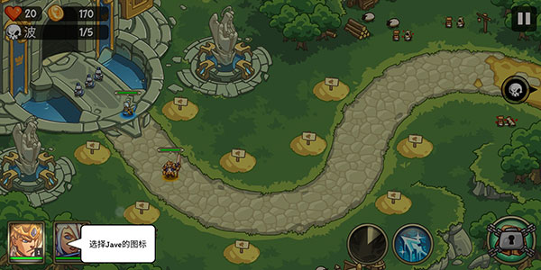 在进入战斗时我们三位英雄边上的土包就是我们需要建造防御塔的地方了,只需要点击土包然后选择防御塔的类型点击对号就可以创建成功,如果金币足够多的话是可以升级你的防御塔的等级越高攻击伤害越大。如果金币不多的话那么优先升级在路口前端最先和敌人战斗的防御塔。