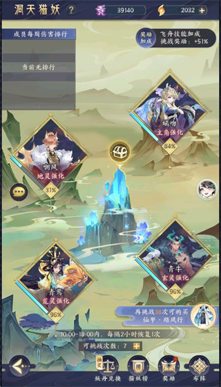 此外洞天猎妖的挑战次数也是每日刷新的,建议在12:00-14:00或18:00-20:00的奖励加成时间内进行挑战。