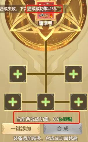 需要注意的是,在合成装备时会显示成功率,若成功率没有达到百分百则会有合成失败的概率,当装备合成失败时,则会损失掉所有装备,但下一次合成装备的成功率会增加15%。