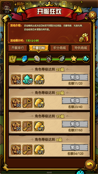 优先冲等级(先到8级、15级)领开服目标奖励,注意名额有限要尽快完成。