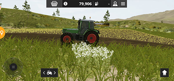 3、这是游戏初期您拥有的田地之一,田里的小麦已经成熟,是时候收割了,使用联合收割机即可收割田里的作物,右侧滑动条是油门,控制前进后退,左侧的方向盘控制左右转弯。