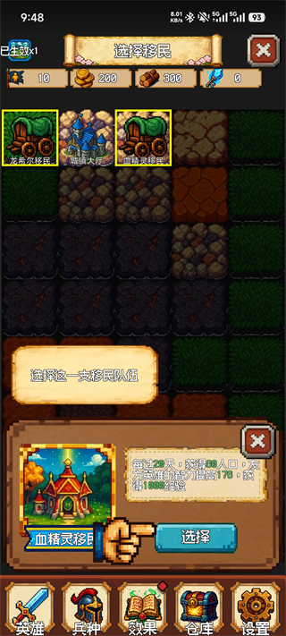 选择“血精灵移民”可带来持续收益:每20天获得80人口、英雄智力+178 与1000经验,能明显提升中后期英雄成长速度。