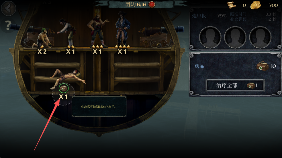水手可能会在战斗中负伤。负伤的水于会被拾往底舱。可以用药物治疗他们。