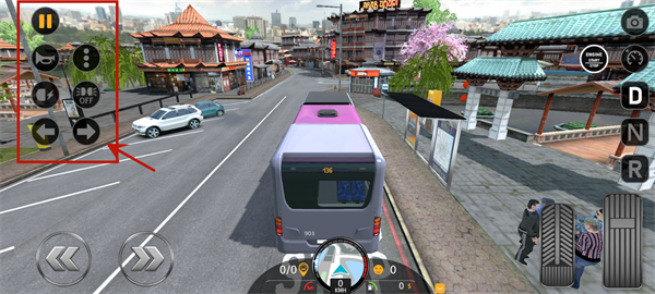 7、进入游戏后就可以操作,在图中为各位小伙伴进行了简单标注,其中D为前进挡,也称驱动挡;N为空挡,暂时停车时(如红灯),注意,此挡位表示空挡,为防止车辆在斜坡上溜动,一定要踩着刹车。R为倒车挡,倒车时用。