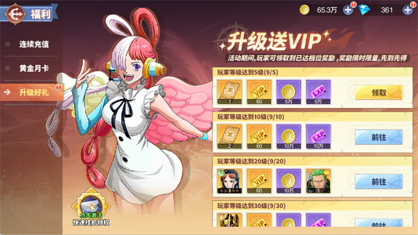 随着角色等级的提升,玩家不仅能解锁VIP福利,还能领取VIP经验、抽卡券、SSR角色等丰富奖励。每升一个档次,都能带来更强的资源支持。