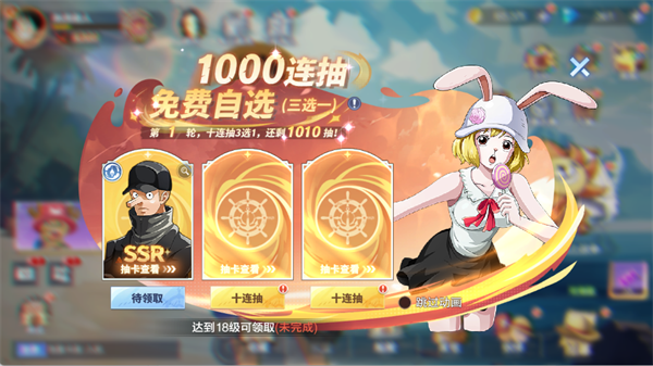 1、新手福利多,开局就送UR尼卡路飞,还有上千次抽卡机会让你免费拿。