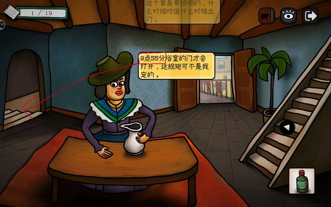 和女人对话,得到提示:浴室门9:55开,阳台上的鸽子要喂,另一个女孩在阳台看书,女人还需要一个杯子