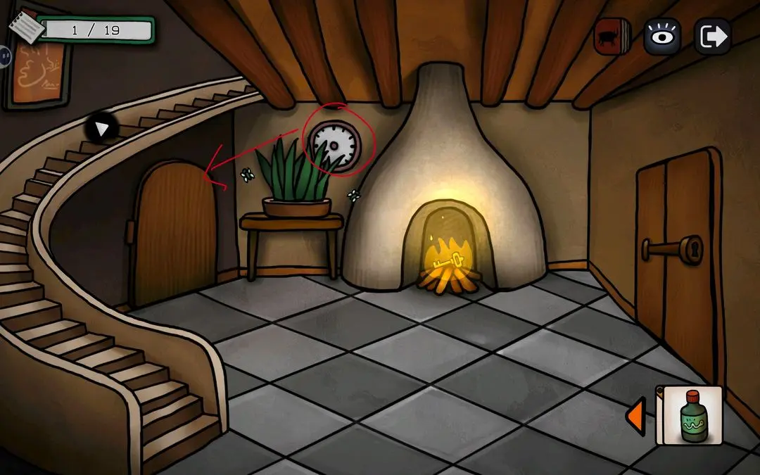拿走空牛奶壶,浇灭壁炉,取钥匙,再用钥匙打开右边的锁
