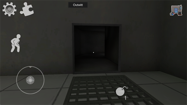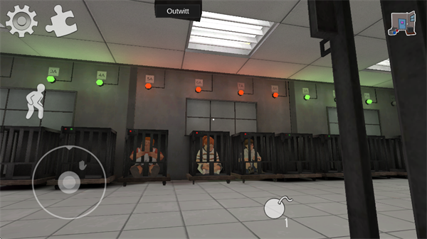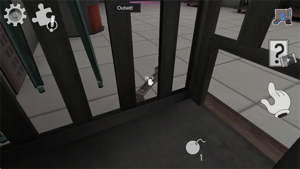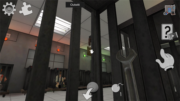1、首先进入游戏我们控制的角色被关在笼子里,通过滑动屏幕转动视角,将屏幕中心点对准可交互物品,右侧手套按钮控制交互,比如开局笼子旁的长凳我们可以点击交互。