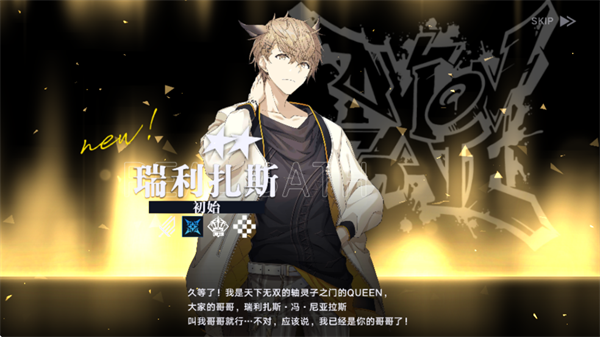 久等了!我是天下无双的轴灵子之门的 QUEEN,大家的哥哥,瑞利扎斯・冯・尼亚拉斯叫我哥哥就行… 不对,应该说,我已经是你的哥哥了。