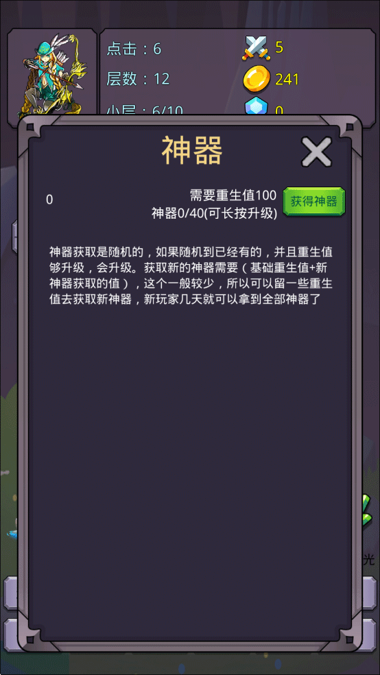 神器目前有11个,一部分是战力型神器,比如暴打挂机神器,可以增加自动攻击力,还有一些功能性神器比如跳关神器。建议萌新们前期升级一些战力型神器,加攻击的,加金币获取的,10倍金币几率,升级英雄费用减免的,后面战力起来了,打的关卡多了,再考虑点跳关神器,后面跳关神器也是特别重要的。