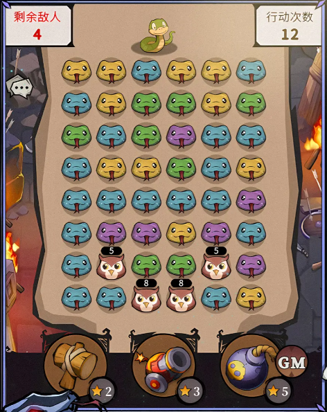2、玩法:通过连接蛇蛇,来对猫头鹰照成伤害并击败。