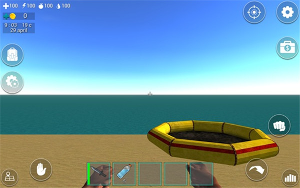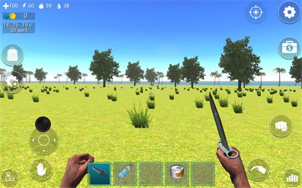 在屏幕下方的道具栏中有一把匕首和5瓶水,我们点击匕首即可拿在手中。在屏幕左上角有四个图标数字,分别表示血量、体力值、饥饿值、口渴值。