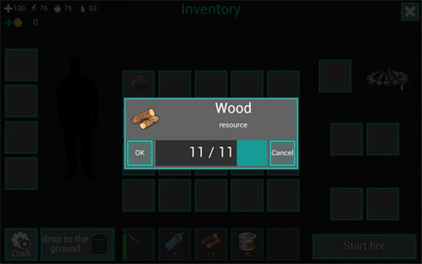不过现在我们首先要做的还是一个火堆,制作一个火堆需要7个木头,点击火堆,然后点击右下角的“Craft”,即可制作出来。