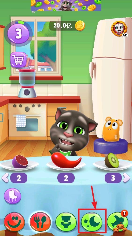 点击这个按键会带汤姆猫到餐厅,桌子上摆着的东西,玩家可以喂给我们汤姆哦。