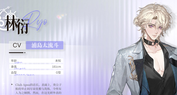 ClubApsu的店长。表面上,贵公子般的举止间尽显优雅与洗练,令所有人为之倾倒。然而,在这光鲜外表的背后,是因复杂的过往而留下的残破不堪的内心,而被他用完美的伪装深深隐藏。即便如此,这颗纤细而敏感的灵魂,依然渴望拼尽自己的全部去守护那唯一珍贵的存在。