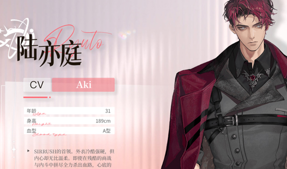 SIRRUSH的首领。外表冷酷强硬,但内心却无比温柔。即使在残酷的商战与内斗中拼尽全力杀出血路,心底的那份纯真善良依旧未曾褪色。童年复杂的家庭经历深深影响了他,使他对“家的温暖”有着格外的渴望。他非常喜欢做饭,但一旦紧张起来,总是难免失手。