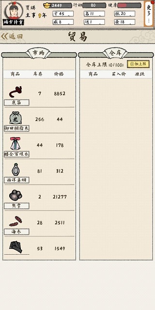 在《红楼梦人生》中,获取财富的手段有三条:稳定的科举收入,逐步削减的产业收入,以及不稳定的贸易收入。在三者中,贸易收入是需要玩家随时关注每回合市场刷新产品的收入,来进行低买高卖,以获得差价利润的。