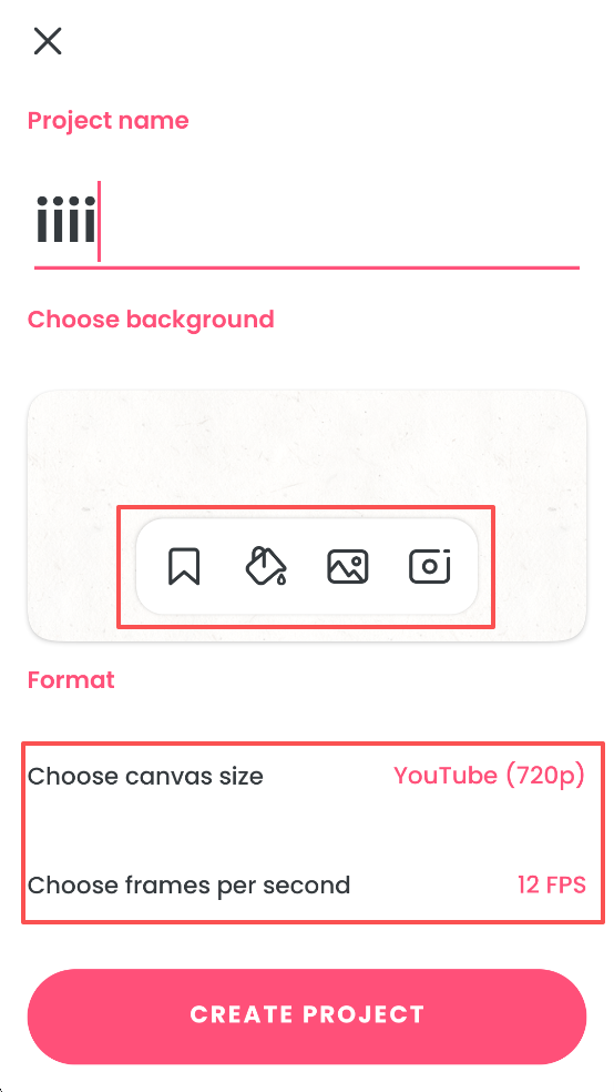 2、输入动画名称,选择背景、画质以及帧率,然后点击创建项目