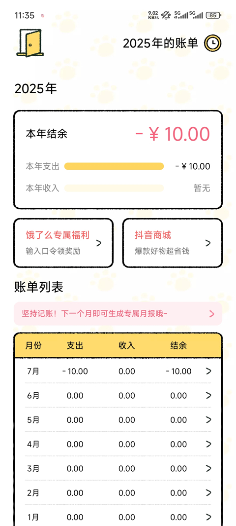 3、在保持可爱游戏化视觉风格的同时,提供实用的周期账目统计,支持按周、月、年度自由切换查看。