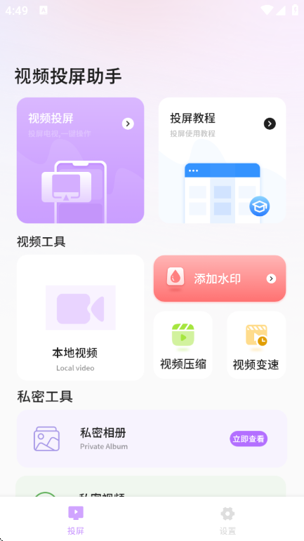 作为一款主打便捷操作的投屏工具,视频投屏助手app最新版能帮你快速将手机内的各类内容无缝投射至其他设备,整个投屏过程运行流畅无卡顿,让你轻松享受高清稳定的视觉体验,同时软件内置了丰富多样的免费功能设置,从基础投屏优化到个性化参数调整一应俱全,搭配详细易懂的新手教程,即使是初次使用也能快速上手,更贴心配备在线压缩、播放变速、自定义水印添加等实用功能,进一步提升工具的使用价值,为日常办公、影音娱乐等场景带来高效便捷的投屏解决方案。