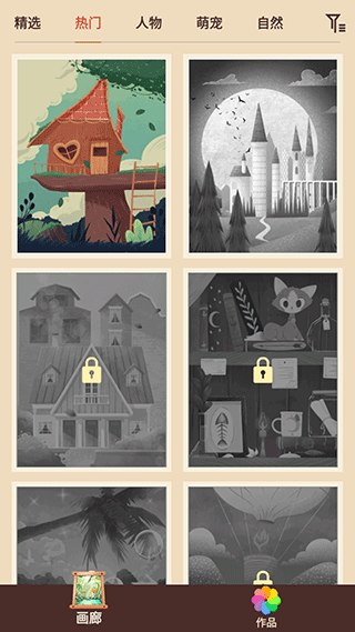 1、下载并打开软件,首页可以看到很多黑白图画;