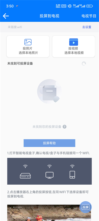 1、请将手机与电视/盒子等设备链接到同一WIFI