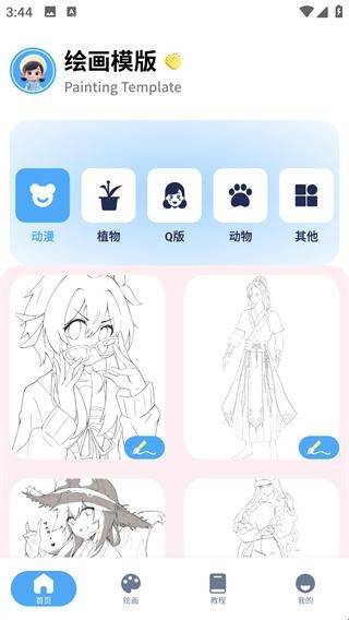 1、打开软件,首页有丰富的功能,有丰富的线稿素材,方便大家进行选择并涂色。