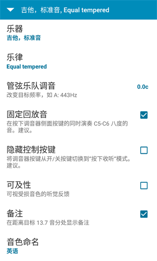gstrings调音器能通过手机麦克风实时捕捉乐器声音,精准检测音高频率,并在直观的界面上清晰显示偏差方向,帮助你快速完成吉他、小提琴、尤克里里乃至拇指琴等各类弦乐器的调校。无论是通用的标准调弦模式,还是满足特殊演奏需求的自定义调弦,它都能灵活应对。简洁明了的操作界面让初学者也能轻松上手,而高精度的检测功能同样能满足专业音乐人的严格要求。刚开始接触乐器的新手,或者需要日常维护乐器的演奏者,这款功能全面且响应灵敏的调音助手都能为你提供可靠支持,让每一次演奏都保持在最佳状态。