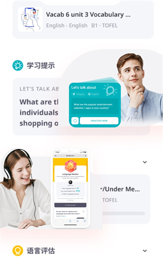 3、享受超越传统课堂的学习体验,包含免费水平测试、话题创作工具和激励性语言挑战。