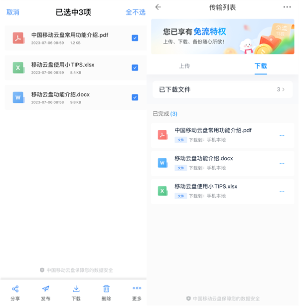用户可以对云端所有格式的文件进行下载操作,选中需要下载的文件后下载即可。下载后的文件统一在客户端下载界面中进行管理;无网情况下,可以对已经下载的文件进行查看、暂停等操作。