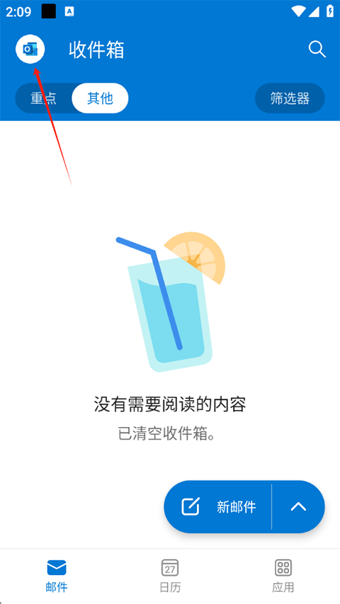 1、打开微软邮箱App,点击左上角Outlook邮箱图标;