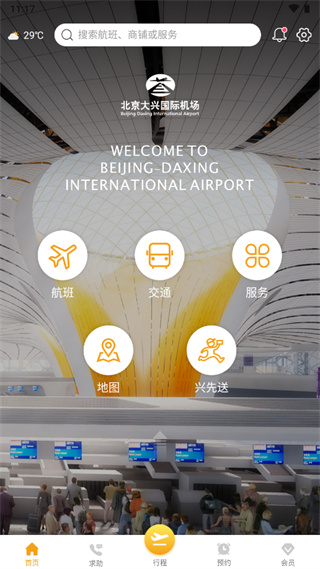 1、升级页面设计与交互体验:更新主视觉设计,与大兴机场线下风格保持一致;更新主页页面设计,按出行场景划分功能区域,整合商业与服务信息。