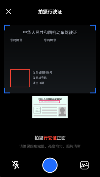 2、拍摄行驶证,拍摄时确保行驶证四角完整、亮度均匀、照片清晰。
