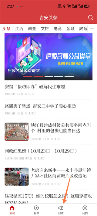1、打开吉安头条App,在首页浏览新闻时,点击进入「问政」板块。