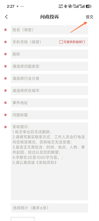 2、在问政页面右下角,点击「我要投诉」按钮,进入投诉填写界面。