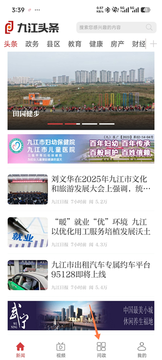 打开九江头条App,首页可以浏览新闻资讯,点击底部的【问政】。