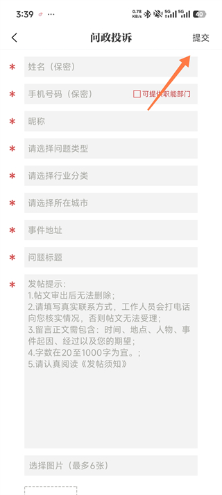在问政页面右下角,点击【我要投诉】按钮,进入投诉填写界面。