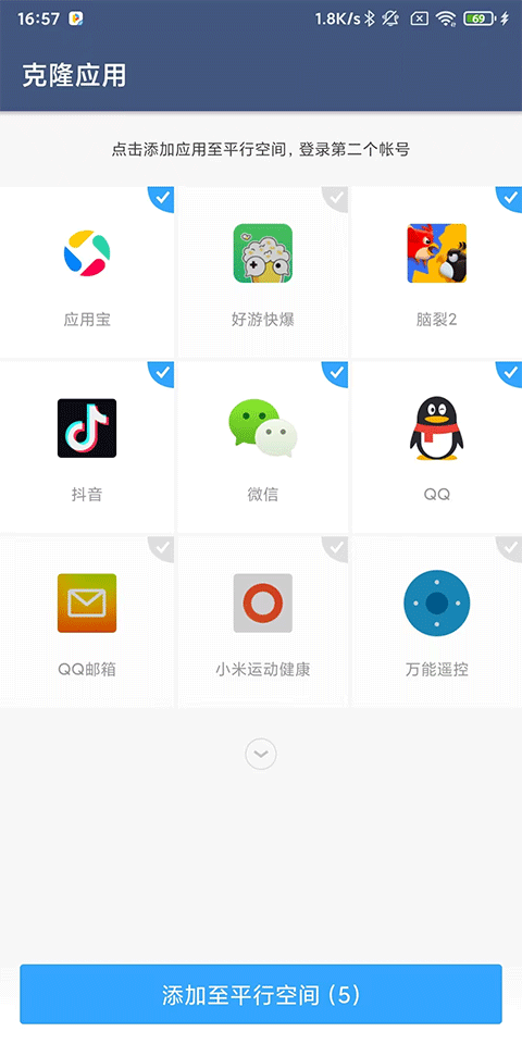 1、打开平行空间APP专业版,点击添加应用至平行空间,登录第二个账号;