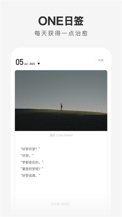 1、ONE一个手机版下载推荐APP的首页,会有一系列的高质量文章,配上高清的图片,让人有一种身临其境的感觉。