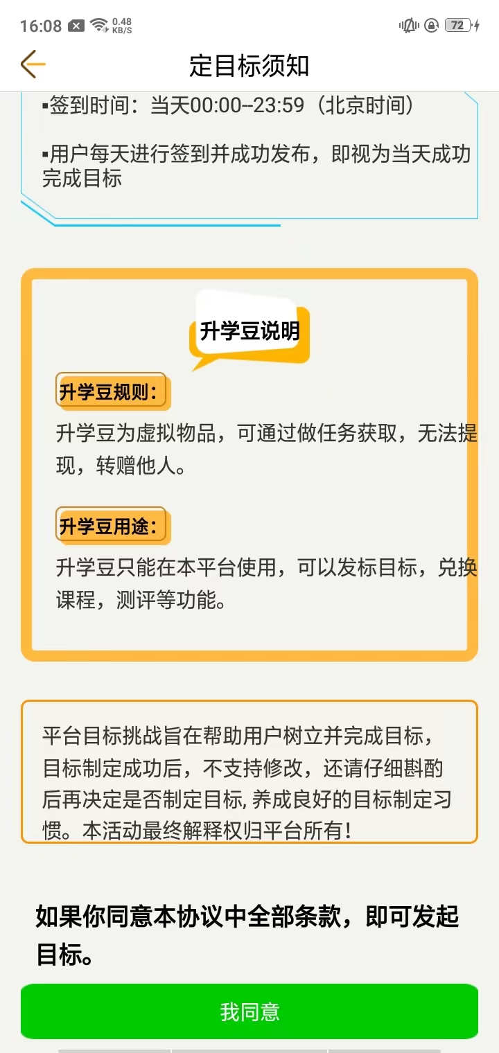 注意:用户发起目标时需谨慎设置。发起目标后,中途无法退出直到目标挑战完成。用户发布违反国家法律法规的目标平台有权将该目标停止,损失将由用户自行承担。用户遇到不可抗力(如地震、火灾等因素)以及网络无法连接、手机丢失等因素所导致的目标挑战失败损失将由用户自行承担。
